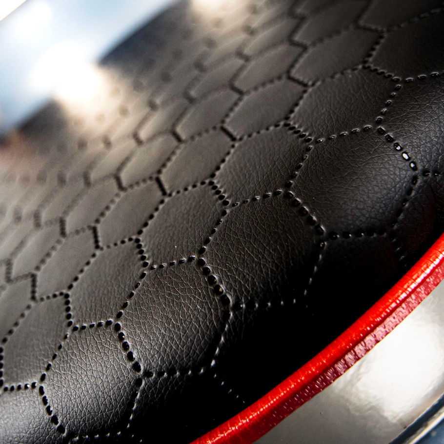Storage space is available underneath the leather seating pad. Simply pull the tab and reveal the storage within the drum itself.